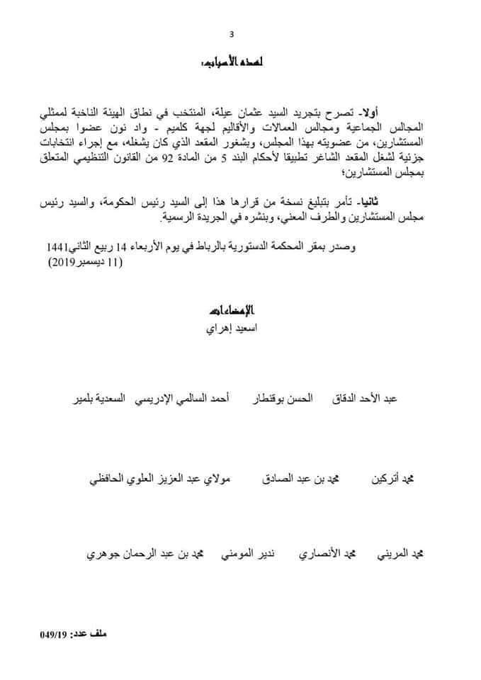 ويأتي قرار المحكمة بعد اطلاعها على الرسالة المسجلة بأمانتها العامة في 30 أكتوبر 2019 التي ينهي فيها الوكيل العام للملك لدى محكمة النقض إلى علم المحكمة الدستورية بصدور قرار نهائي بتاريخ 23 أكتوبر2019 في ملف جنحي، قضى برفض طلب النقض المقدم من طرف عثمان عيلا، عضو مجلس المستشارين، ضد القرار الصادر عن محكمة الاستئناف بأكادير بتاريخ 2 يناير 2017، القاضي بإدانته من أجل جنحة محاولة الحصول بطريقة مباشرة على صوت ناخب أو عدة ناخبين بفضل هدايا أوتبرعات نقدية أو عينية أو منافع أخرى قصد التأثير بها على تصويتهم، ومعاقبته من أجل ذلك بخمسة أشهر حبسا موقوف التنفيذ، مع تعديله بالاقتصار في العقوبة الحبسية المحكوم بها على ثلاثة أشهر حبسا موقوف التنفيذ؛