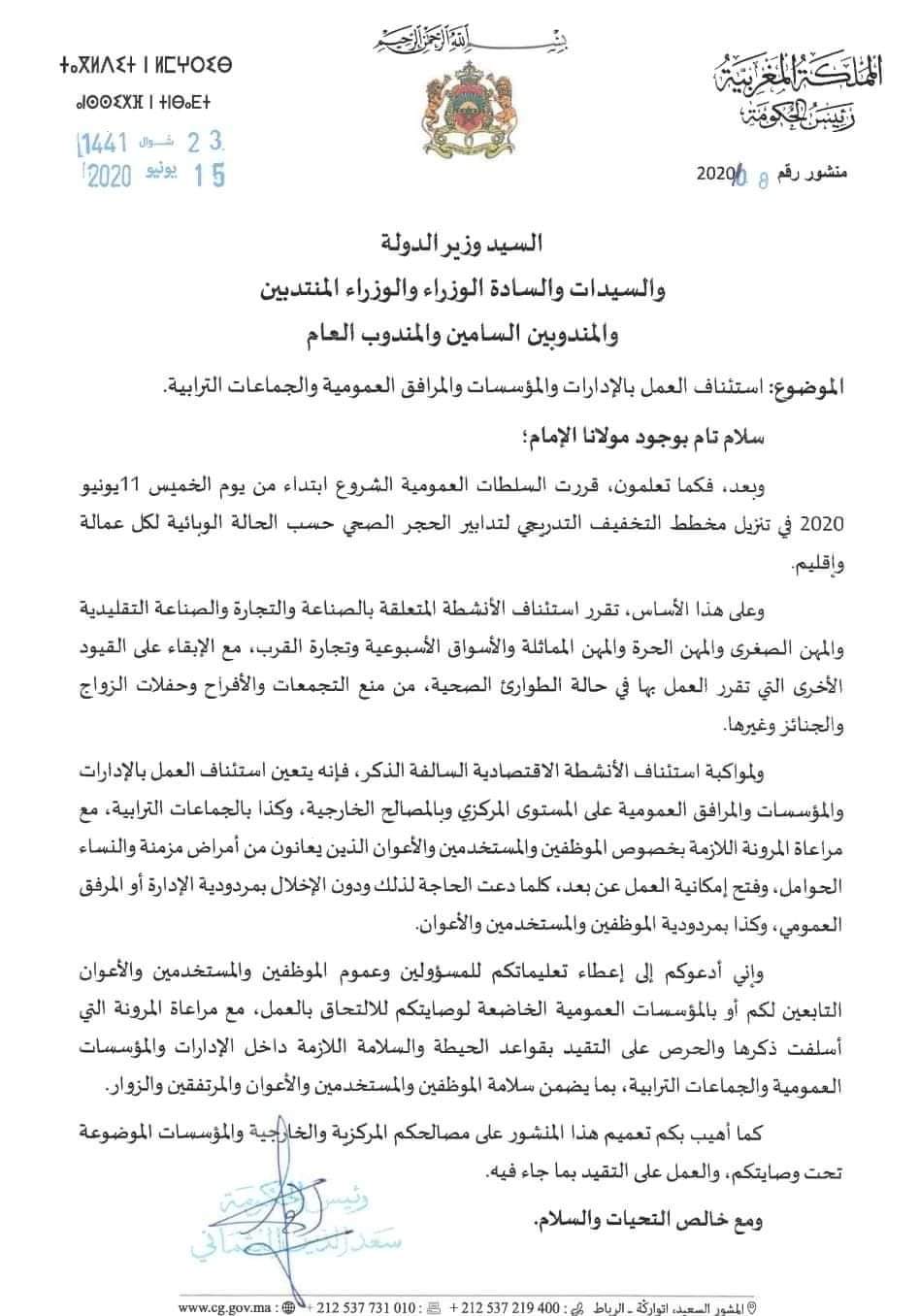 صدر اليوم الإثنين15يونيو الجاري ، عن رئيس الحكومة السيد سعد الدين العثماني منشور يقضي بدعوة الموظفين والمستخدمين والاعوان الى استئناف العمل بالمؤسسات والإدارات العمومية على المستوى المركزي والمصالح الخارجية والجماعات الترابية، حفاظا على السير العادي للمرفق العام، خدمة لمصالح المواطنين.