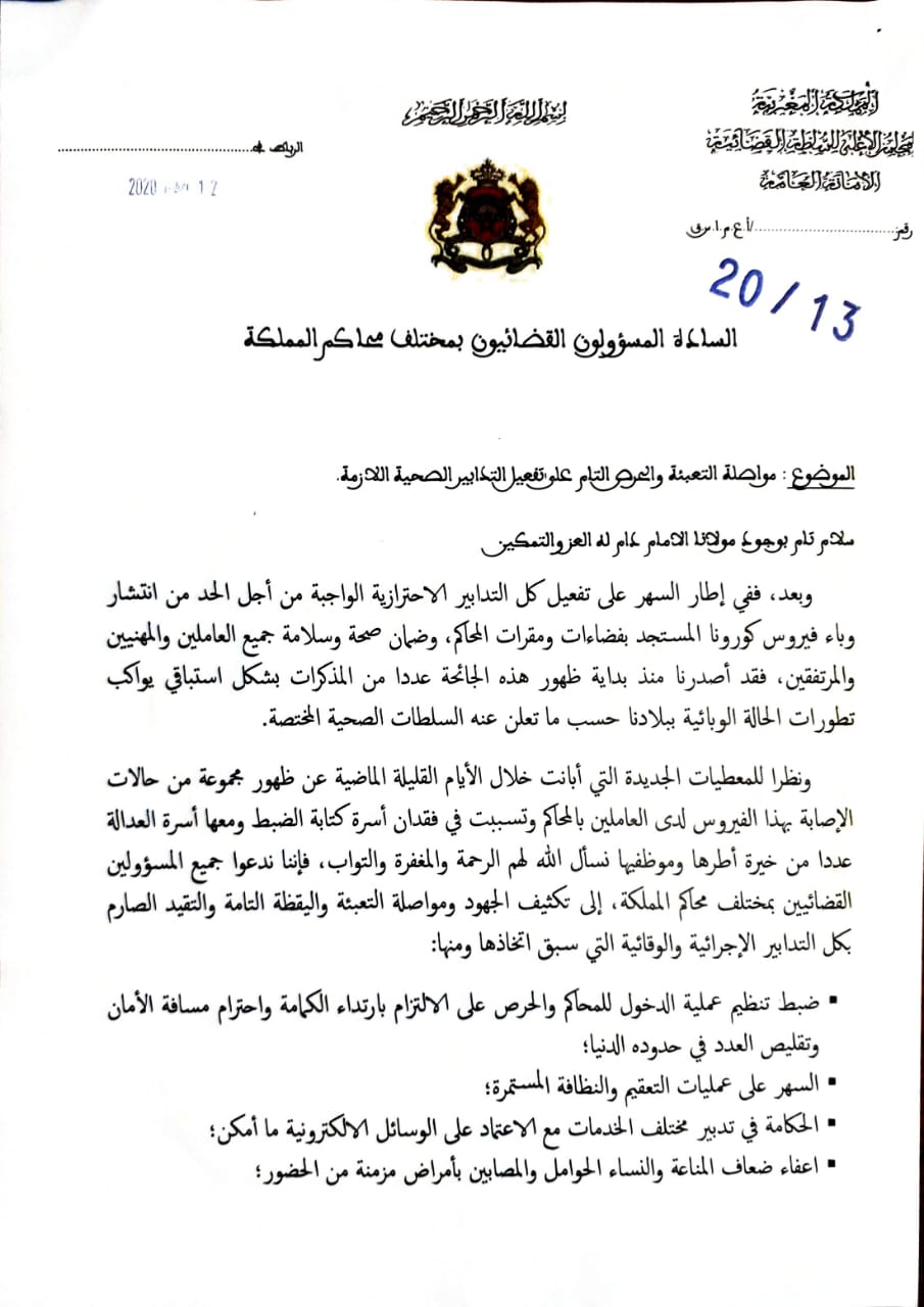 وأكد السيد فارس في هذه الدورية، على ضرورة ضبط تنظيم عملية الدخول للمحاكم والحرص على الالتزام بارتداء الكمامة واحترام مسافة الأمان وتقليص العدد في حدوده الدنيا، والسهر على عمليات التعقيم والنظافة المستمرة، والالتزام بالحكامة في تدبير مختلف الخدمات مع الاعتماد على الوسائل الإلكترونية ما أمكن.