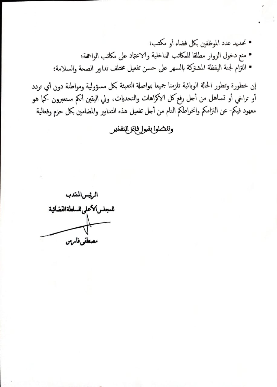 وختم مصطفى فارس الرئيس المنتدب للمجلس الأعلى للسلطة القضائية ، الدورية بالتأكيد على الزامية التعبئة بكل مسؤولية لمواجهة خطورة وتطور الحالة الوبائية:” … تلزمنا جميعا بمواصلة التعبئة بكل مسؤولية ومواطنة دون أي تردد أو تراخي أو تساهل من أجل رفع كل الإكراهات والتحديات”.