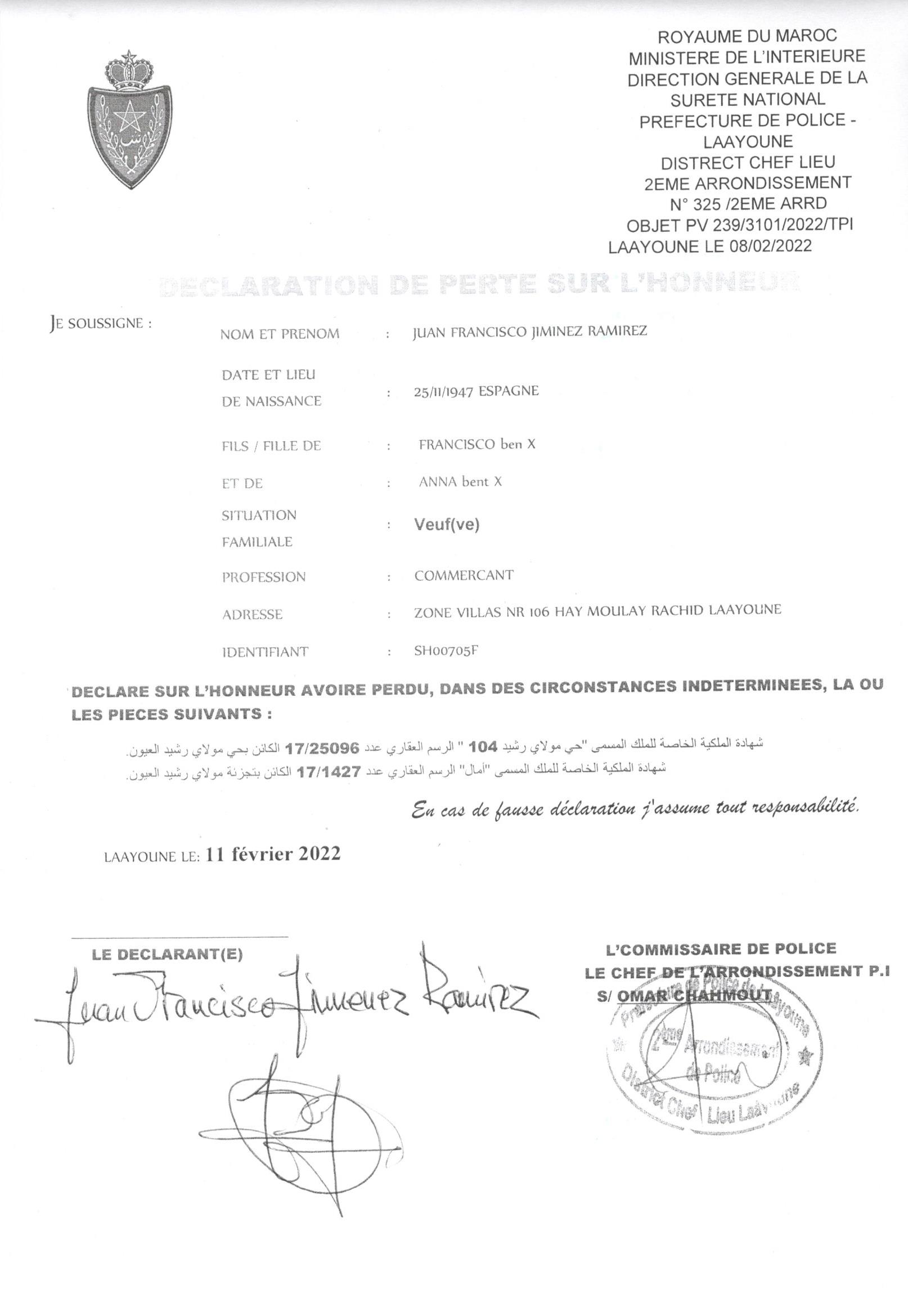 يعلن السيد: خوان فرانسيسكو juan francisco jiminez ramirez ،الحامل لبطاقة التعريف الوطنية رقم : sh00705f،عن ضياع شهادة الملكية الخاصة للملك “المسمى أمال”نظير الرسم العقاري عدد 17/1427والمندرج ضمن ملفات المحافظة على الأملاك العقارية بالعيون ،في ظروف غامضة .