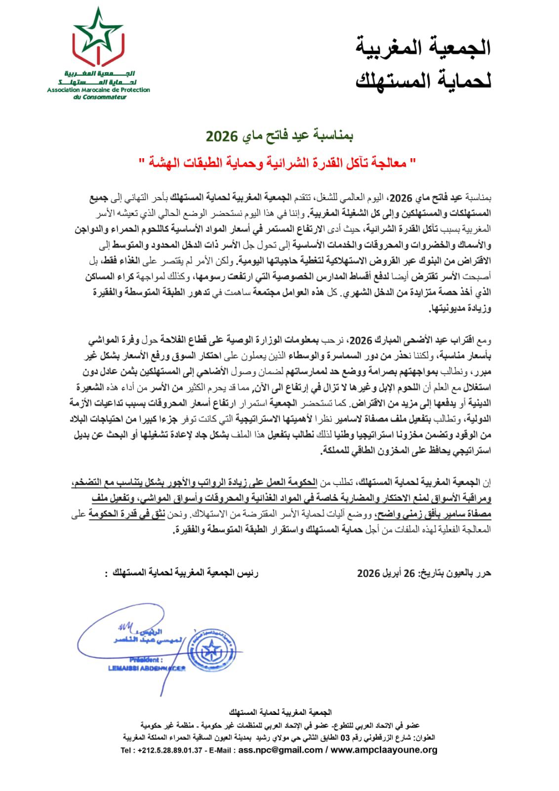 طالبت الجمعية المغربية لحماية المستهلك، في بيان صدر يوم أمس بمدينة العيون بمناسبة اليوم العالمي للشغل (فاتح ماي 2026)، الحكومة بزيادة الرواتب والأجور بما يتناسب مع معدلات التضخم، وتشديد المراقبة على الأسواق لمنع الاحتكار والمضاربة، خاصة في المواد الغذائية والمحروقات وأسواق المواشي.